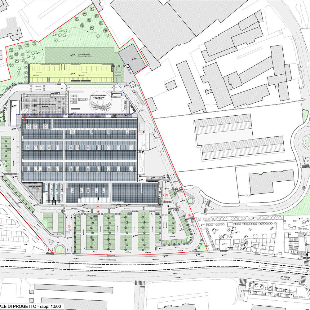 Ristrutturazione di un edificio commerciale esistente di circa 10.000 mq per ospitare una grande struttura, una media struttura di vendita alimentare al piano terra, e uffici privati al piano primo.