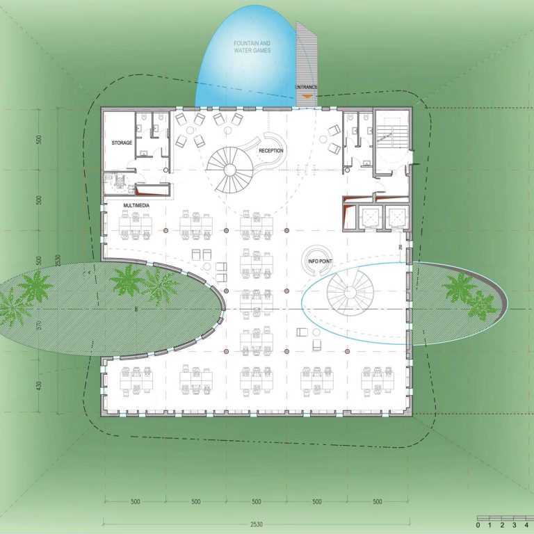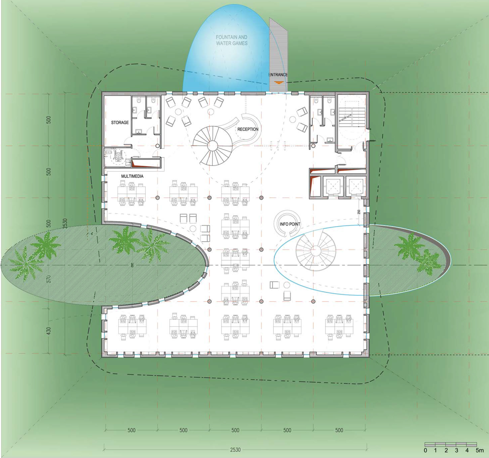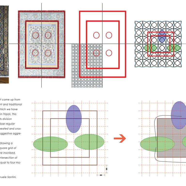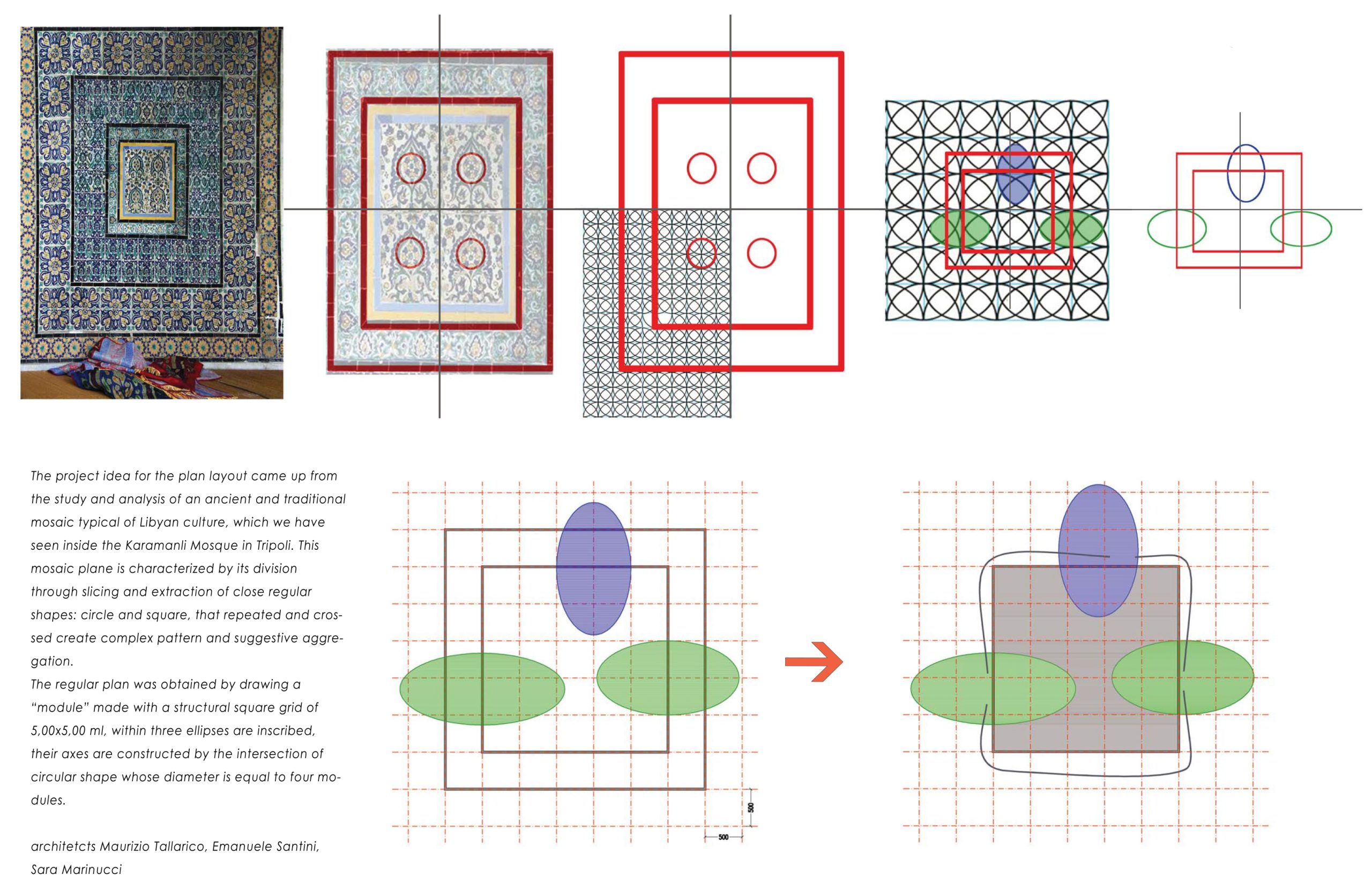The project idea for the pian /ayout come up from the study and anolysis of an ancient ond troditionol mosaic typical of Libyan culture, which we have seen inside the Karamonli Mosque in Tripoli.
