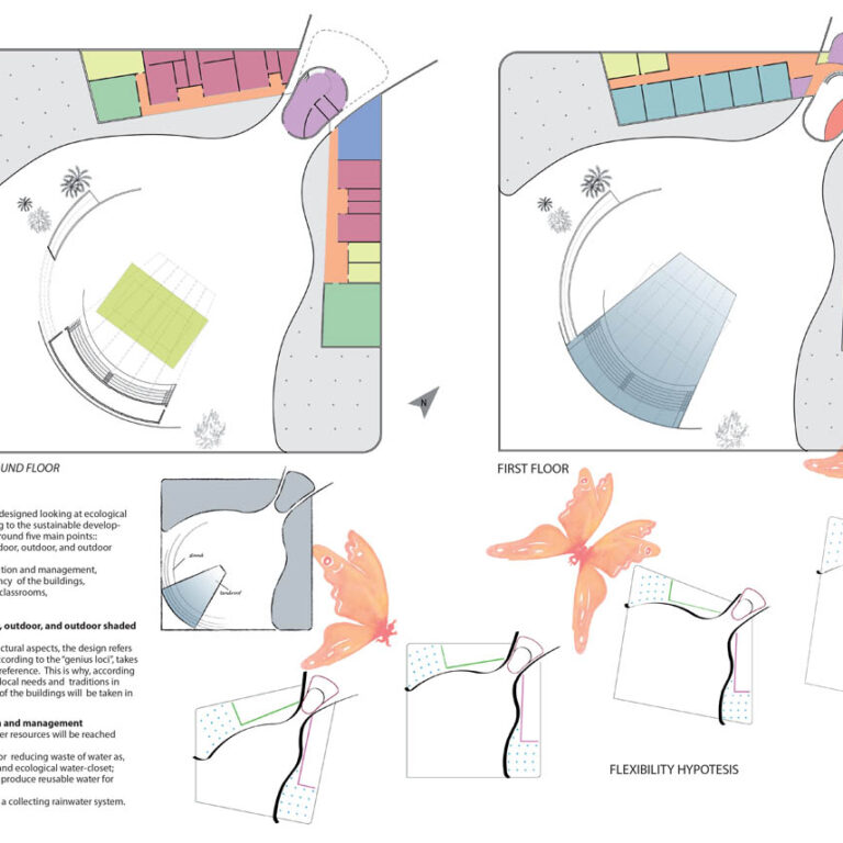 Concerning volumes and architectural aspects, the design refers to the “hearing architecture” that, according to the “genius loci”, takes the local building tradition as main reference. This is why, according to climate and building orientation, local needs and traditions in using the spaces inside and outside of the buildings will be taken in a good consideration.